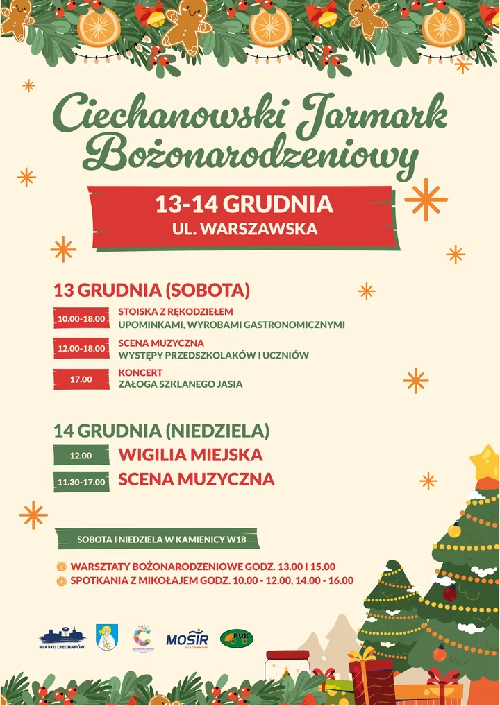 Ciechanowski Jarmark Bożonarodzeniowy odbędzie się w dniach 13–14 grudnia 2025 roku na deptaku przy ul. Warszawskiej. W sobotę i niedzielę od godz. 10:00 do 18:00 będzie można robić zakupy, podziwiać występy i poczuć magię świąt.