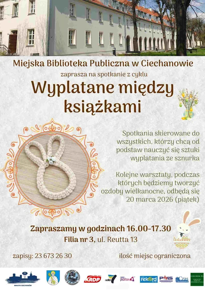Wiosna w Miejskiej Bibliotece Publicznej w Ciechanowie zapowiada się nie tylko książkowo, ale i rękodzielniczo. Cykl „Wyplatane między książkami” zaprasza na spotkanie, podczas którego ze sznurka powstaną drobne, świąteczne dekoracje — idealne do domu lub jako prezent od serca.