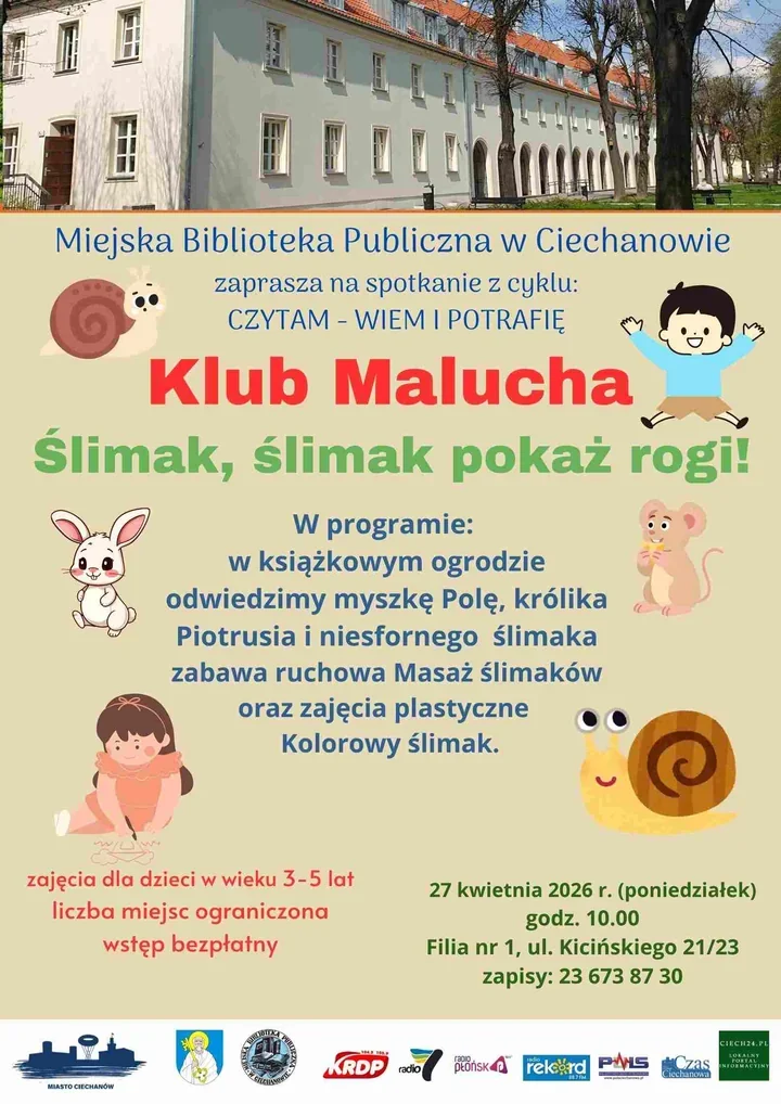 W poniedziałek 27 kwietnia 2026 r. o godz. 10.00 biblioteka zaprasza maluchy wraz z opiekunami na kolejne spotkanie z cyklu Klub Malucha. Tym razem punktem wyjścia będzie świat ślimaków, a razem z nim książkowa opowieść o myszce Poli, króliku Piotrusiu i ogrodowym ślimaku. 📚🐌