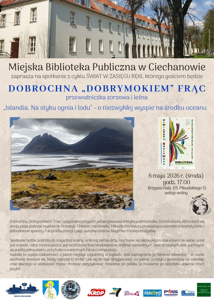 W cyklu „Świat w zasięgu ręki” szykuje się spotkanie autorskie, które zabierze słuchaczy daleko od codzienności, prosto na północny Atlantyk. 6 maja 2026 r., godz. 17.00 Dobrochna „DobrymOkiem” Frąc opowie o Islandii - wyspie ognia, lodu i nocnego nieba pełnego zorzy 🌍✨.