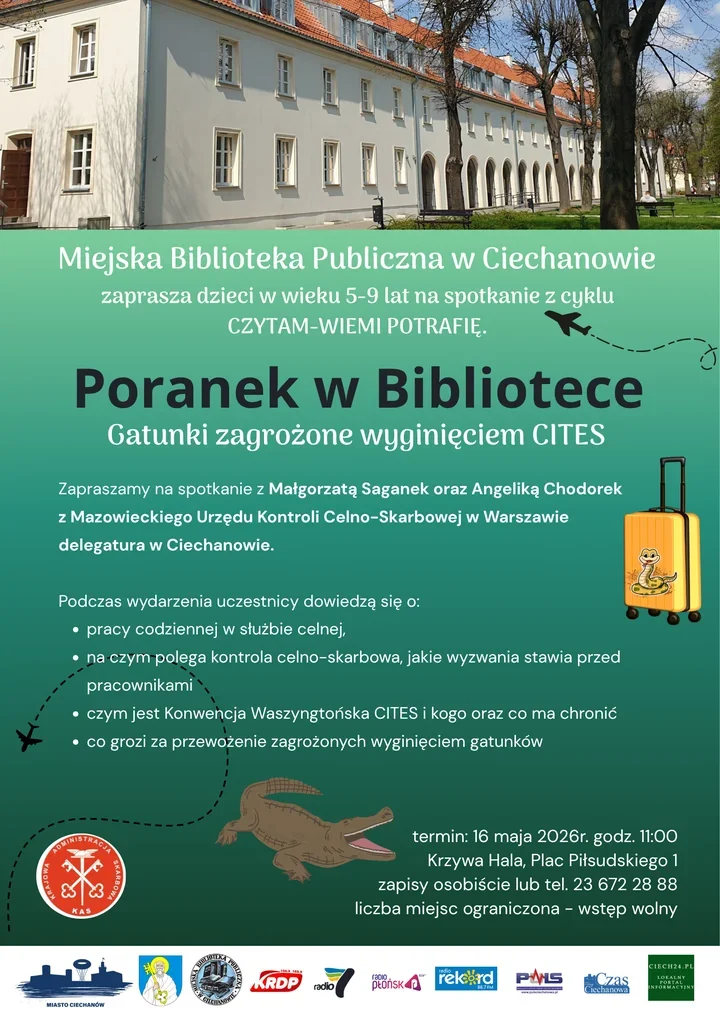 W Krzywej Hali w Ciechanowie szykuje się sobotni poranek, który może zaskoczyć nie tylko dzieci, ale i dorosłych. Biblioteka przygotowała spotkanie dla ciekawskich w wieku 5-9 lat, a tym razem zamiast zwykłej lektury pojawią się mundur, kontrola i opowieść o ochronie zwierząt. 📚🦜