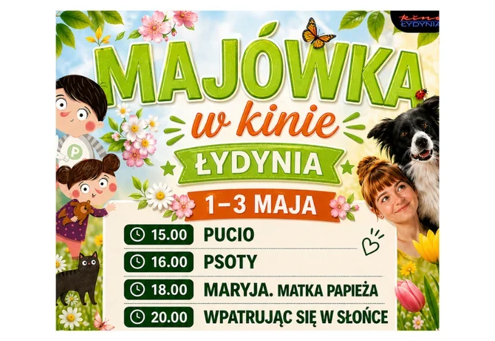 Majówkowy luz da się w Ciechanowie złapać także w kinie. Kino Łydynia przy Powiatowym Centrum Kultury i Sztuki szykuje na 1-3 maja 2026 r. zestaw seansów, który miesza propozycje dla najmłodszych i tytuły na bardziej spokojny, refleksyjny wieczór.